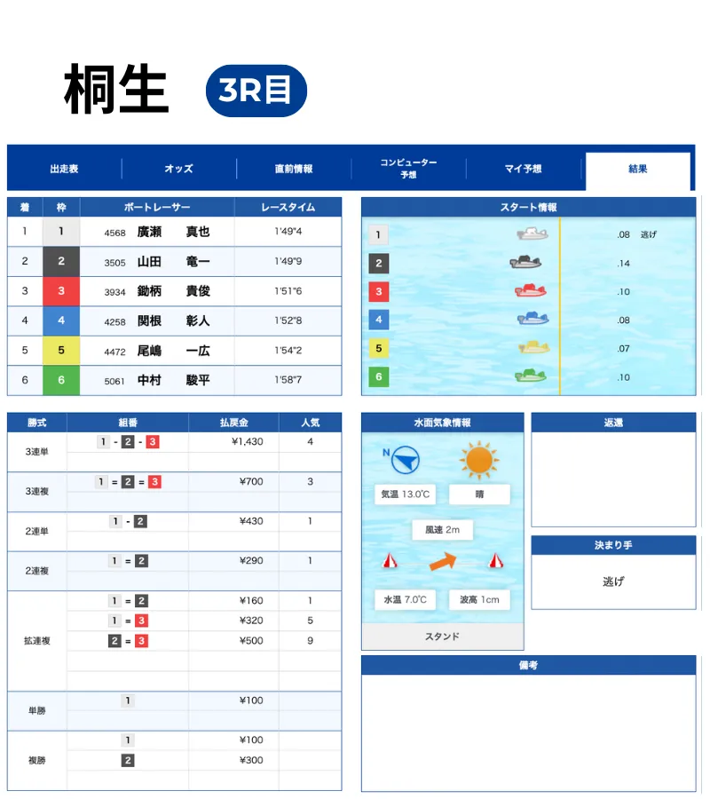 | 桐生3R | 1-2-3 | 的中 | 7,150円 | +3,150円 |