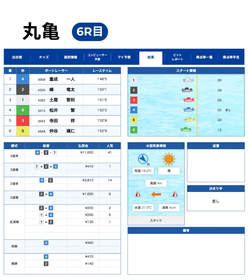 | 無料情報② | 11月10日 | 丸亀6R | 2連単 | 5点 |