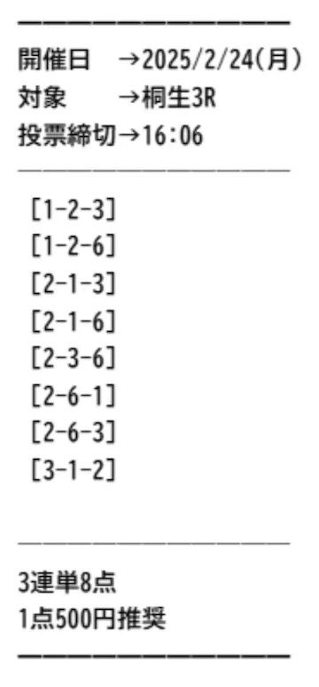 | 無料情報① | 2月24日 | 桐生3R | 3連単 | 8点 |