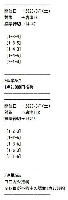 | 有料情報① | 3月1日 | 唐津9R | 3連単 | 5点 | 10,000円 |