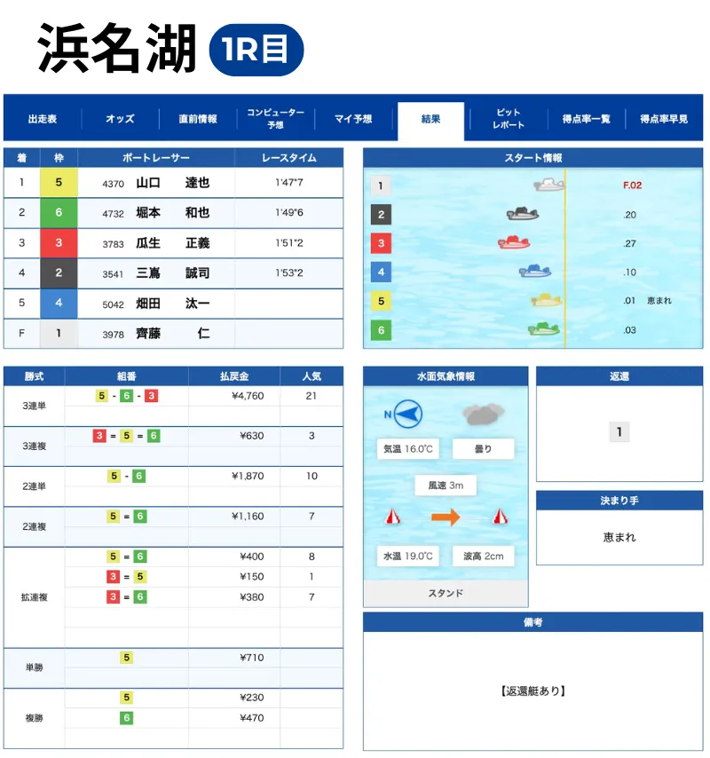 ボートラボの的中率を検証するために、2025年11月5日に配信された無料情報「浜名湖1R・2R」の2レースを実際に検証してみました。