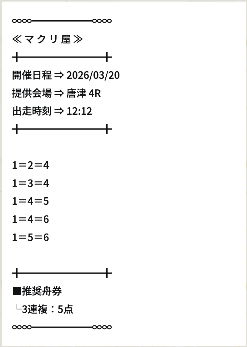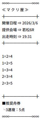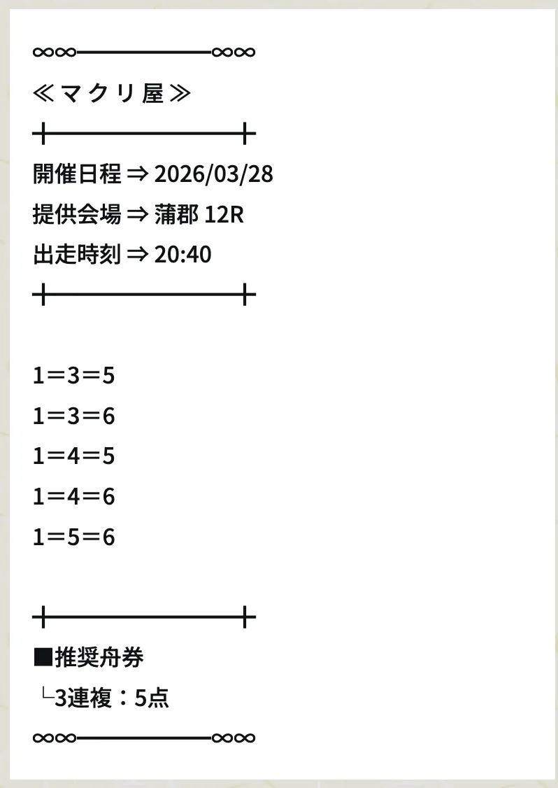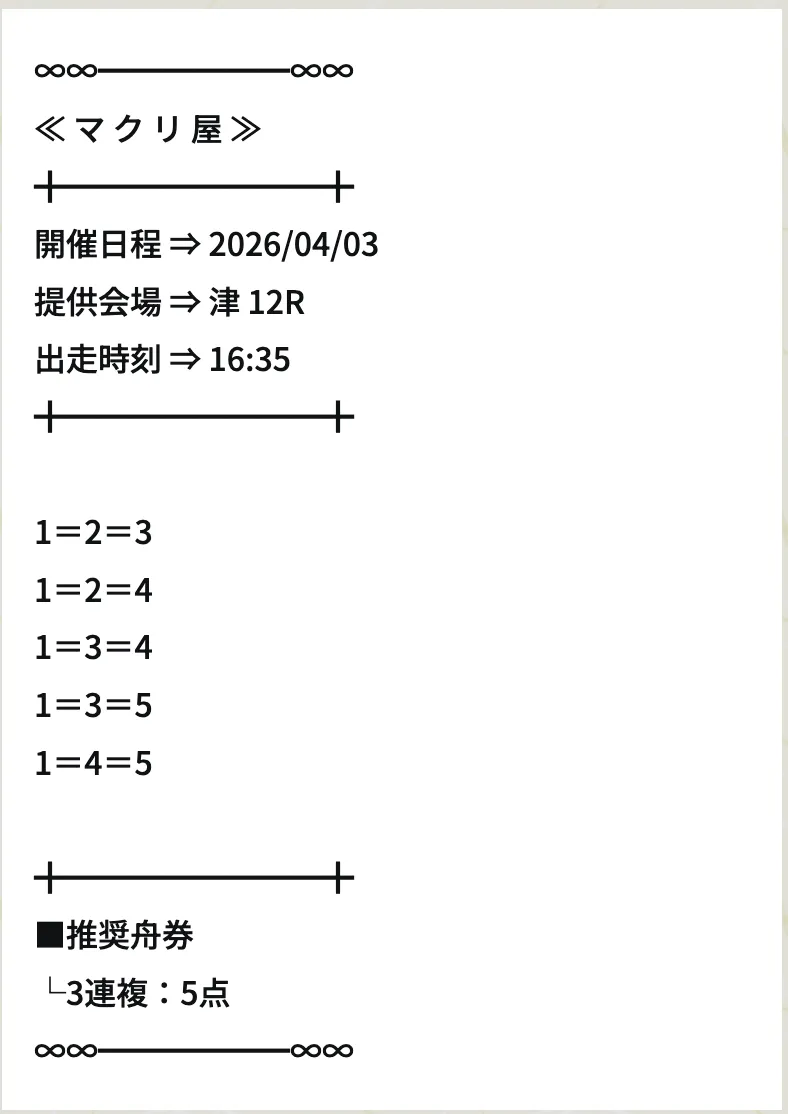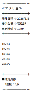 | 桐生10R 買い目 | 1-3-5 / 3-1-4 / 3-5-1 / 5-4-1 / 5-4-3 |