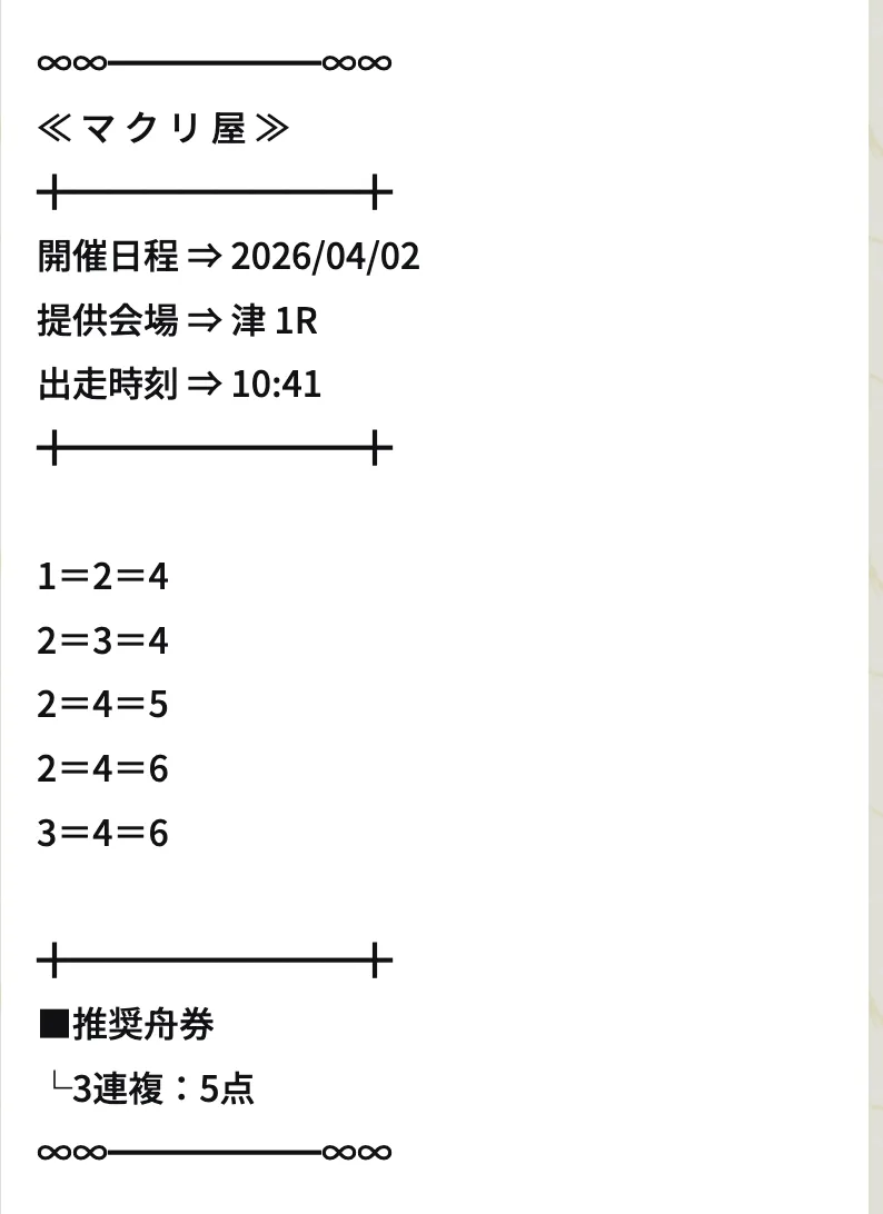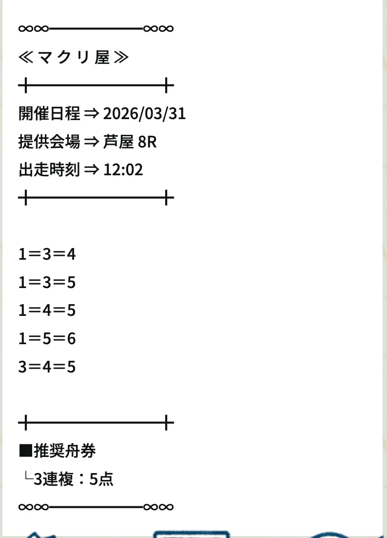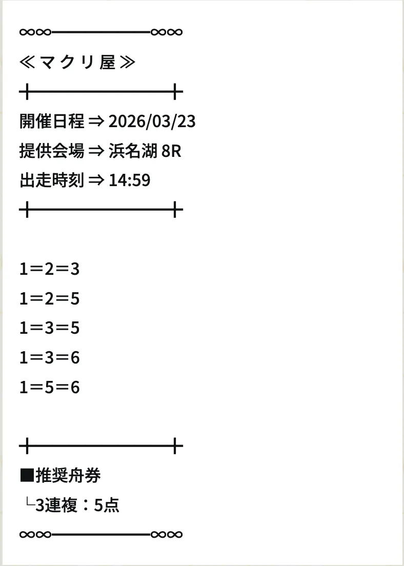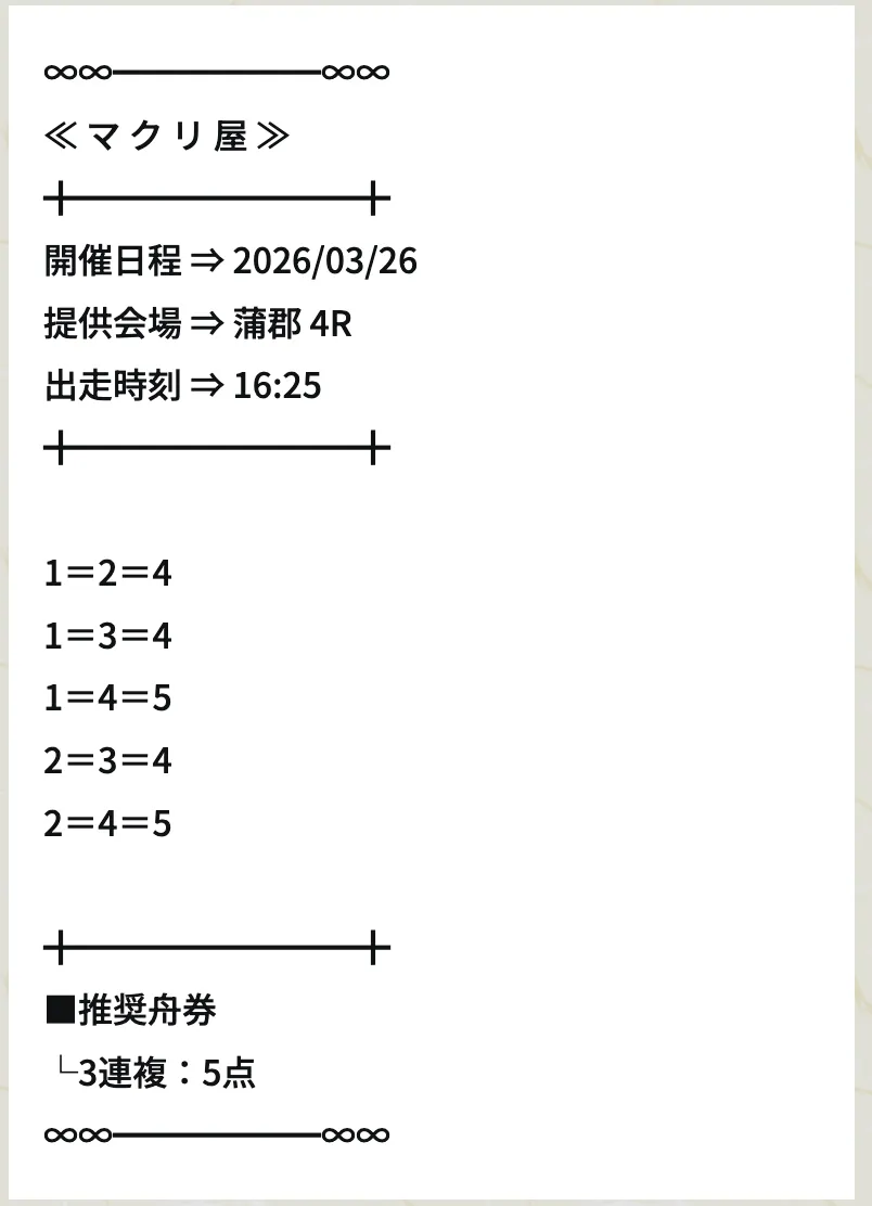 | 桐生10R 買い目 | 1-3-5 / 3-1-4 / 3-5-1 / 5-4-1 / 5-4-3 |