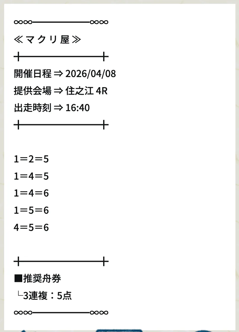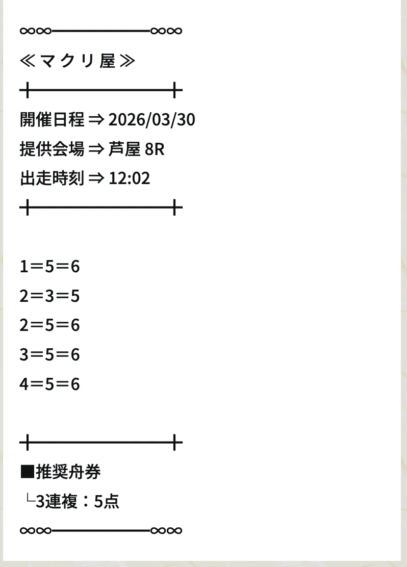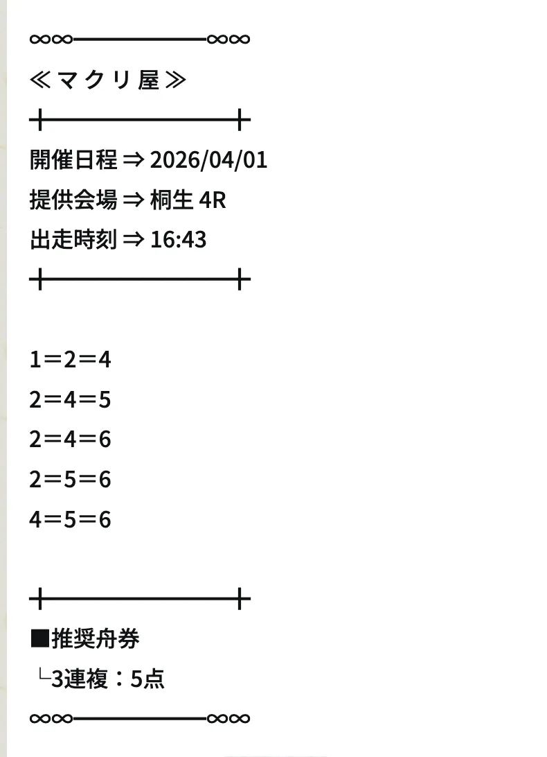 | 桐生4R 買い目 | 2-3-5 / 3-5-6 / 5-3-2 / 5-6-2 / 6-5-3 |