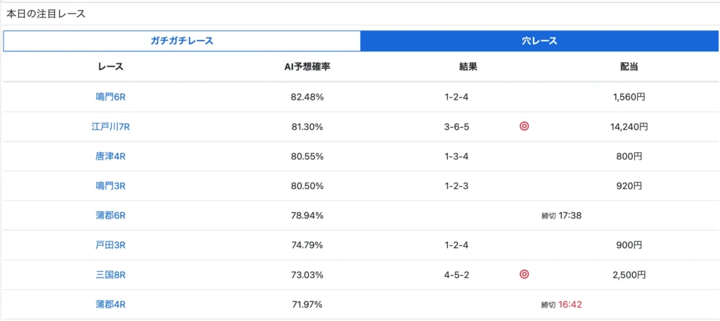 管理人がAIの算出データの中から特に自信のあるレースを厳選し、3連単4点で公開しているものですが、精度は低い傾向です。