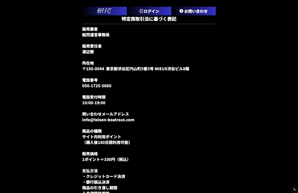 艇閃は法人名を名乗らない「事務局」運営であり、拠点は渋谷のバーチャルオフィスです。さらに連絡先は050のIP電話。