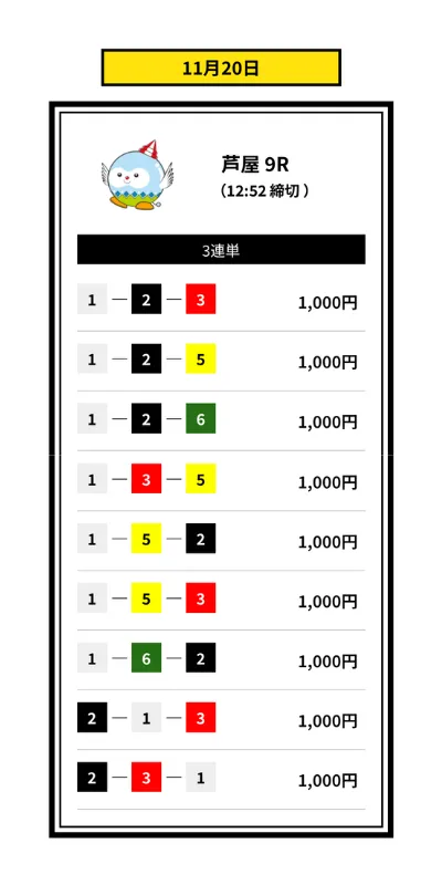 | 無料情報② | 11月20日 | 3連単 | 10点 | 10,000円 |