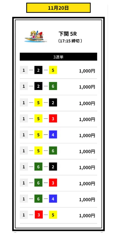 | 下関5R | 1-3-5 | 的中 | 15,600円 | +5,600円 |