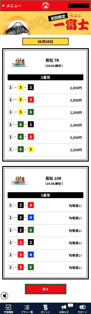 今回の初回限定プラン「一富士」は、2レース連続的中(コロガシ成功)という非常に高い成果を残しました。